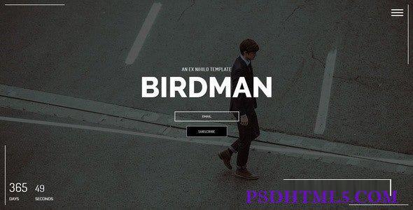 Birdman is a fully responsive under construction/coming soon template with a modern design suitable for all creative fields. The template is featuring a powerful fullscreen background video and imagery making it a perfect choice for photographers, artists and designers who want to showcase their work while building a website.